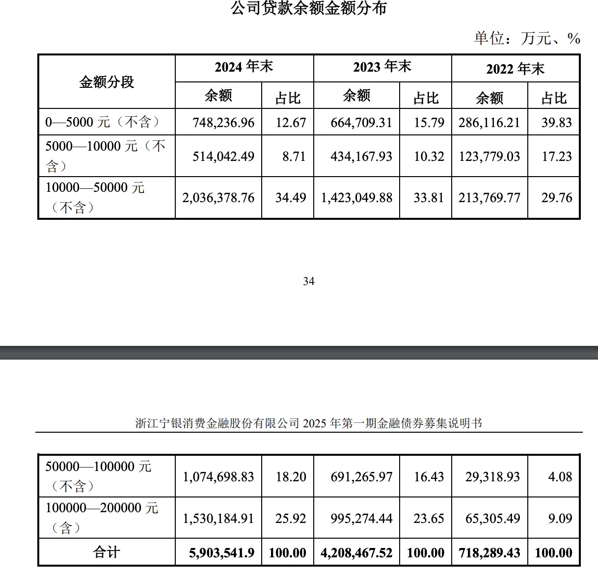 据披露,宁银消金贷款呈现小额分散的特点,截至2024年末,笔均放款金额为0.23万元。从贷款金额分布来看,1万元-5万元段的贷款余额最多。从贷款用途分布来看,贷款业务主要集中在日常消费类贷款、装修类贷款等。截至 2024 年末,公司其他综合类贷款、装修贷款占贷款总额的比重分别为 56.55%、16.66%。