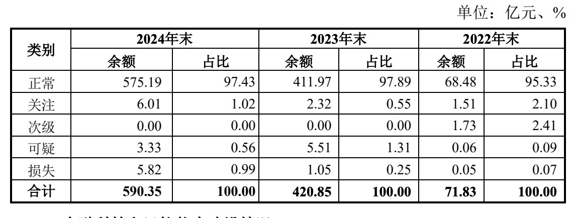 发行文件披露了宁银消金详细的业绩:2024年全年,宁银消金实现营收29.9亿元,同比增长65.96%;净利润3.03亿元,同比增长50.17%。截至去年末公司总资产接近600亿元,发放贷款和垫款为 581.17亿元,较上年末增长39.46%。不良率为1.55%,低于行业平均水平。