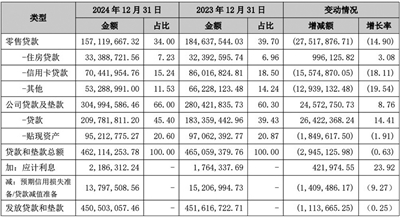 具体看,截至2024年末,广州银行的公司贷款及垫款为3049.95亿元,比上年增加245.73亿元,增幅8.76%;零售贷款为1571.20亿元,比上年减少275.18亿元,降幅14.90%。在零售贷款中,住房贷款、信用卡贷款、其他金额分别为333.89亿元、704.42亿元和532.89亿元,同比变动幅度分别为3.08%、-18.11%和-19.54%,在该行贷款和垫款总额中的占比分别为7.23%、15.24%和11.53%,除住房贷款占比提升,其他两类占比均有所下降。针对零售贷款余额减少,广州银行表示“主要是优化零售业务资产结构所致”。