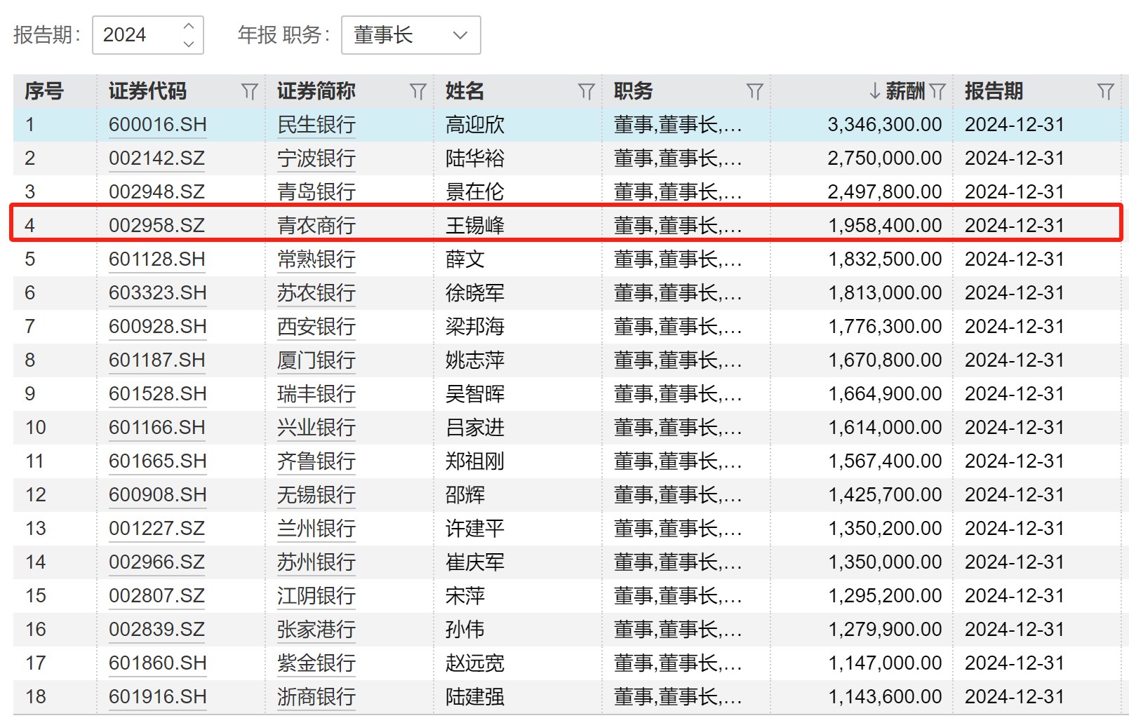 其中,作为青农商行董事长的王锡峰2024年税前薪酬195.84万元,在已披露董事长薪酬的A股上市农商行中拔得头筹。
