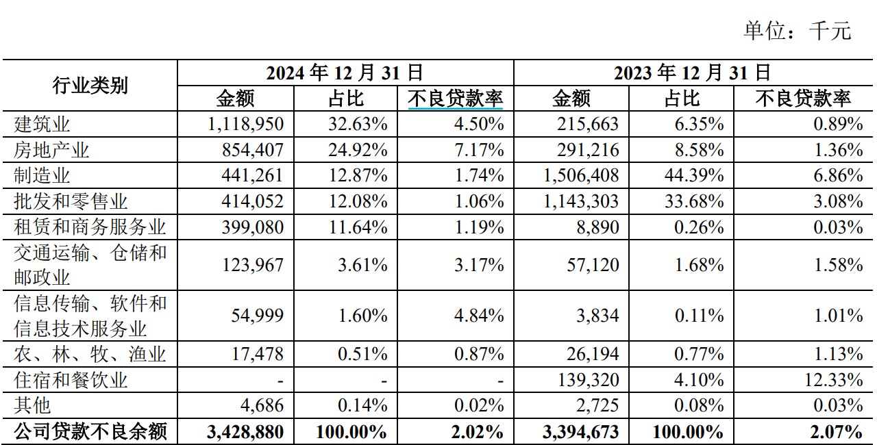 从按行业划分的公司贷款不良余额分布情况来看,截至2024年末,青农商行房地产业及建筑业的不良贷款率均大幅走高,分别由上年末的1.36%及0.89%,上升至7.17%及4.50%。