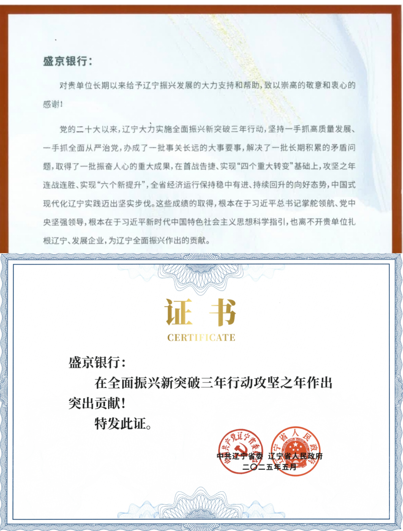2024年是辽宁全面振兴新突破三年行动的攻坚之年,作为根植辽沈的总部银行,盛京银行按照省市党委安排部署,积极融入全面振兴新突破三年行动,持续深化金融改革创新,将服务区域经济高质量发展作为核心使命,全力支持辽宁打造新时代“六地”目标和“八大攻坚”任务。这份荣誉,是省委、省政府对盛京银行深耕本土、服务地方的充分肯定与高度认可。