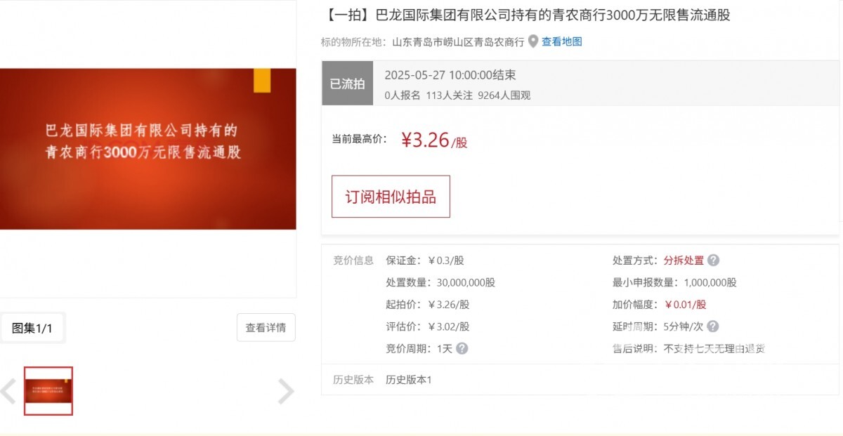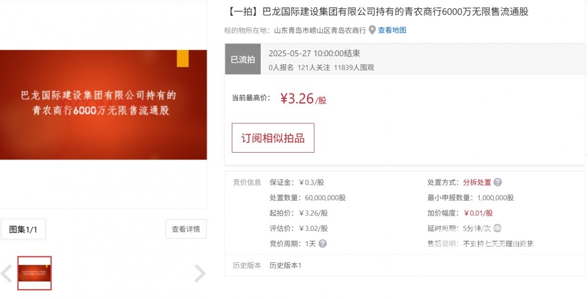 信网5月27日讯 5月26日10时至5月27日10时,青岛市市南区人民法院在京东司法拍卖网络平台上分两次公开拍卖巴龙国际集团有限公司(以下简称“巴龙集团”)持有的,青农商行6000万股和青农商行3000万股。目前,该拍卖已结束,无人出价。