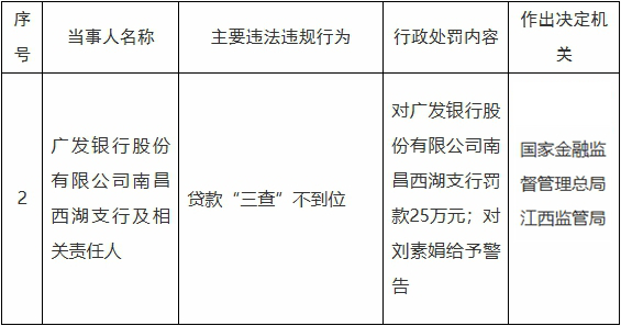 国家金融监督管理总局江西监管局对广发银行股份有限公司南昌西湖支行罚款25万元;对刘素娟给予警告。