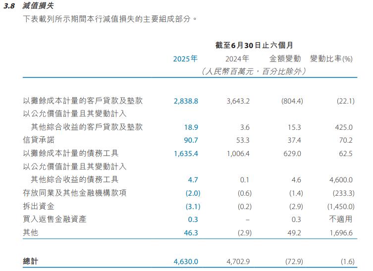 2025年上半年,天津银行减值损失为46.3亿元,较上年同期减少0.7亿元,同比降幅1.6%,主要是由于该行提速不良资产清收处置,资产减值损失同比减少。