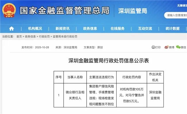 消费日报网讯(记者 卢岳)10月28日,深圳金融监管局向深圳前海微众银行股份有限公司(简称“微众银行”)下发一张行政处罚信息公示表。