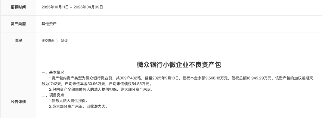 阿里资产交易平台显示,近期一笔微众银行的小微企业不良资产包正在招商中。该资产包的资产为微众银行面向小微企业授信并放款的“微业贷”产品,资产包内共计310户483笔债权,截至2025年9月22日,资产包本金余额9,567.28万元,息费罚余额7,437.41万元,债权总额17,004.69万元。资产包户均本金余额30.86万元,户均债权总额54.85万元。截至2025年9月22日,债权金额占比52.08%的资产未诉。