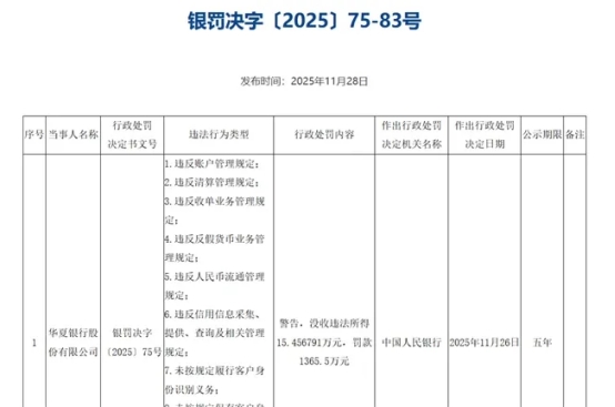 据中国人民银行的本次罚单显示,华夏银行因涉及违反账户管理、清算管理、收单业务、反假货币、人民币流通、信用信息管理以及未按规定报送大额交易报告或者可疑交易报告等十项违法违规行为,被处以警告、没收违法所得15.46万元,并处罚款1365.5万元。同时,该行8名相关责任人员被处以警告及罚款,个人罚款最高达13万元。该处罚决定日期为2025年11月26日。