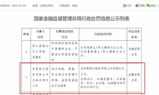 此次处罚是华夏银行继9月5日后收到来自银行业的第二笔巨额罚款。据国家金融监督管理总局的9月5日的罚单显示,该行因“相关贷款、票据、同业等业务管理不审慎,监管数据报送不合规”等问题,被处以8725万元罚款,对陈成天、刘建新警告;对钱建华、何羽、吕玉梅、涂超警告并罚款合计20万元。其年内两次处罚累计罚没金额已超1亿元。