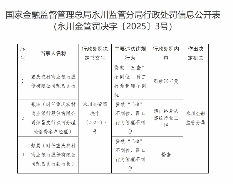 根据行政处罚决定书,重庆农村商业银行股份有限公司荣昌支行存在贷款“三查”不到位、员工行为管理不到位的违法违规行为。永川金融监管分局依据《中华人民共和国银行业监督管理法》等相关法律法规,对重庆农商行荣昌支行的违法行为作出处罚决定。同时,时任该行双河分理处信贷客户经理的张波被禁止终身从事银行业工作;时任副行长的赵晨因管理失职受到警告处罚。(信网记者)