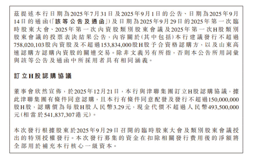 不久后的9月1日,威海银行公告称,该行分别与山东高速集团及山东高速订立附生效条件的内资股认购协议。