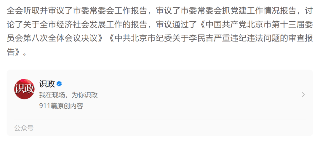 据微信公众号“识政”消息,12月22日,中国共产党北京市第十三届委员会第八次全体会议召开。消息称,全会审议通过了《中国共产党北京市第十三届委员会第八次全体会议决议》《中共北京市纪委关于李民吉严重违纪违法问题的审查报告》。