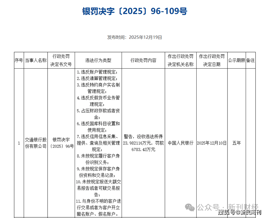12月19日,交通银行因11项违法违规行为,被中国人民银行开出了总额6807.41万元的罚单——没收违法所得23.982116万元,并处罚款6783.43万元。同时,13名总行核心部门责任人被追责,罚款金额从0.4万元至17万元不等。这一“天价罚单”并非“天降罚单”,深入探究其中原委,就会发现交行基础合规管理的问题。