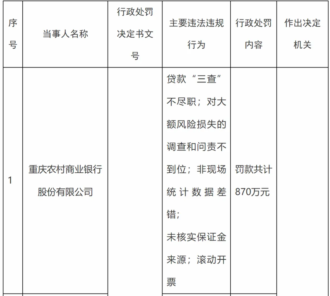 近日,国家金融监督管理总局重庆监管局发布行政处罚信息显示,重庆农商银行因存在贷款“三查”不尽职等五项违法违规事实被罚共计870万元。
