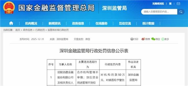 12月31日,国家金融监管总局深圳金融监管局发布行政处罚信息公示表显示,招联消费金融股份有限公司(以下简称“招联消费金融”)因合作机构管理不审慎、贷后资金用途管理不到位,被罚款50万元,同时对责任人盛莲给予警告处分。