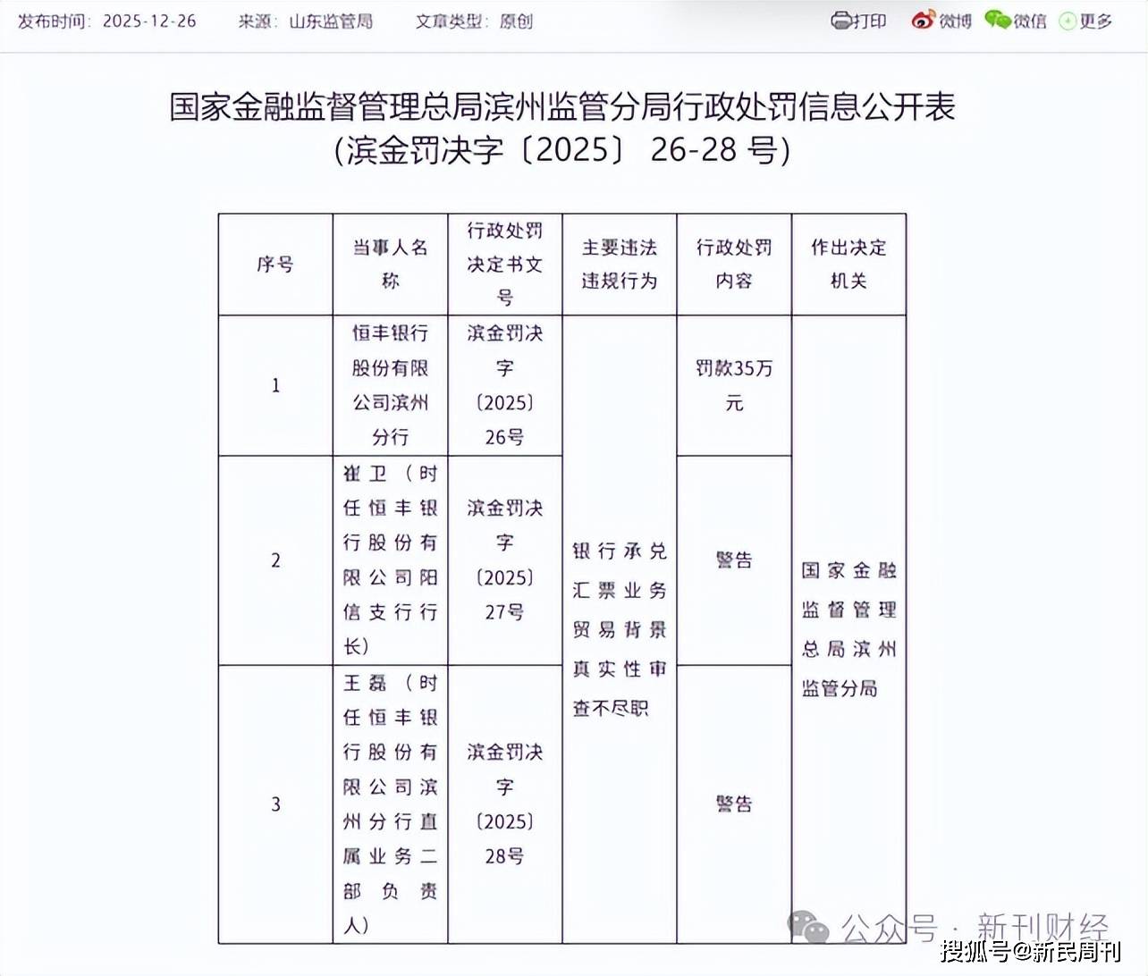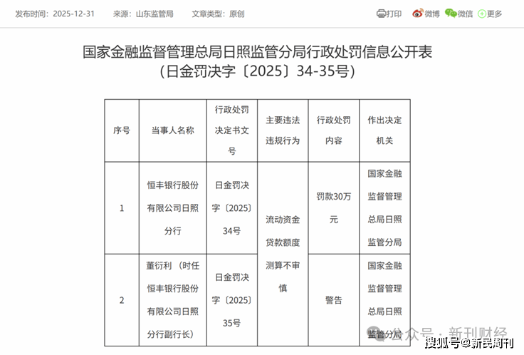 岁末年初,监管罚单密集落地,多家银行被“点名”。恒丰银行尤为“惹眼”——2025年12月末,恒丰银行滨州分行、日照分行、泉州分行接连领罚,违规领域集中于信贷全流程、数据报送等核心业务。