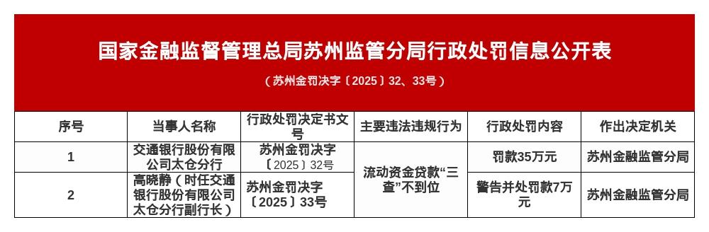 针对上述违法违规行为,国家金融监督管理总局对其罚款35万元;对时任交通银行股份有限公司太仓分行副行长高晓静警告并处罚款7万元。