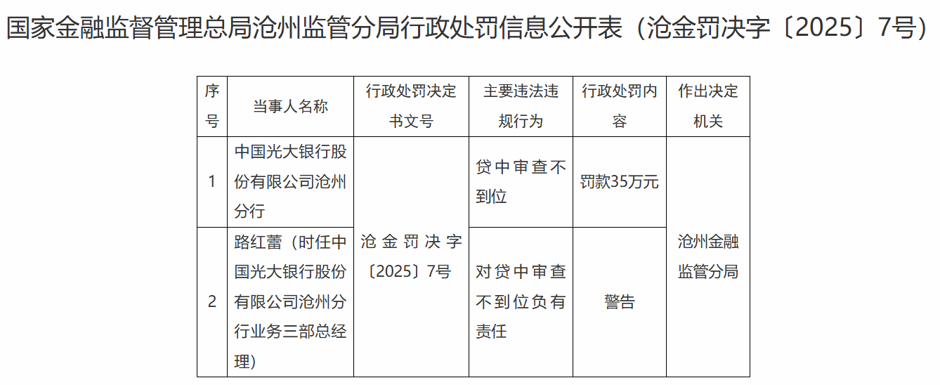 中国光大银行股份有限公司沧州分行贷中审查不到位,被处罚款35万元。时任中国光大银行股份有限公司沧州分行业务三部总经理路红蕾,对贷中审查不到位负有责任,被处警告。