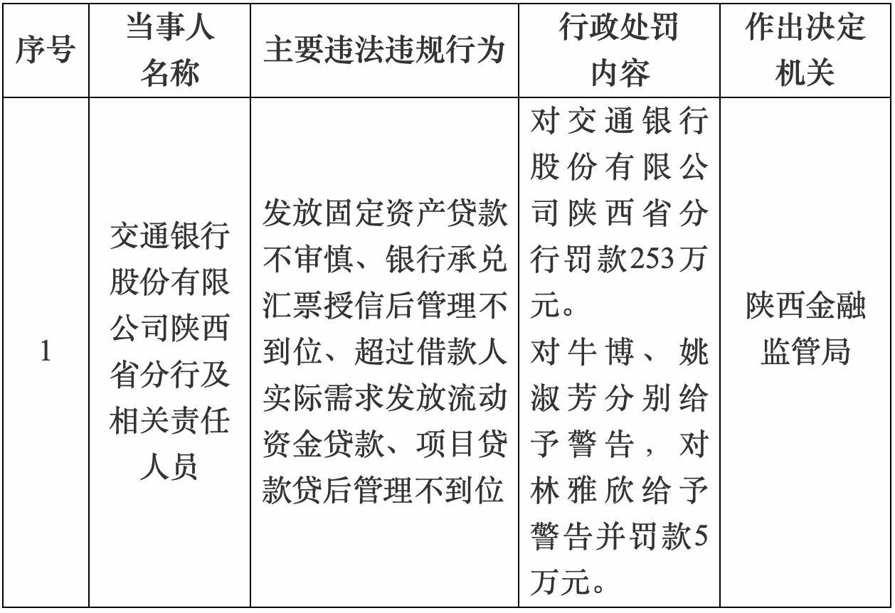 针对上述违规行为,陕西金融监管局依法对交通银行股份有限公司陕西省分行处以罚款253万元。同时,对相关责任人员牛博、姚淑芳分别给予警告处分,对林雅欣给予警告并处罚款5万元。