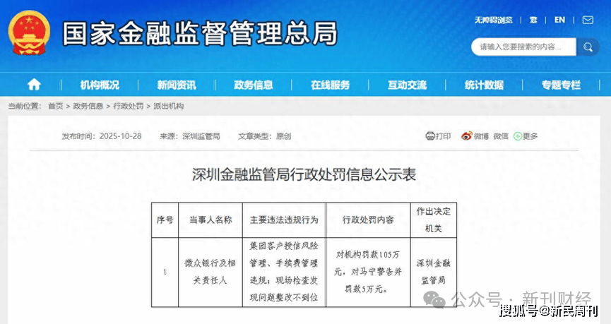 这种颓势显然给微众银行带来了“业绩焦虑”,随之而来的就是更大的助贷业务扩张力度,还有对于风险管控与合规建设的忽视。2024年,微众银行因为违反账户管理规定、未按规定履行客户身份识别义务等五项严重违规行为被罚1387万元,创下民营银行领域年度最大罚单纪录;2025年,时任行长李南青新增首席合规官职务后不久,国家金融监管总局深圳监管局就在10月28日对微众银行开出了百万罚单,理由是集团客户授信风险管理、手续费管理违规及现场检查问题整改不到位。