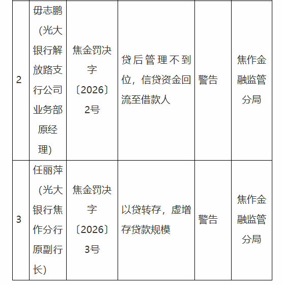 毋志鹏(光大银行解放路支行公司业务部原经理)存在以下违法违规事实:贷后管理不到位,信贷资金回流至借款人。焦作金融监管分局决定对其处以警告。