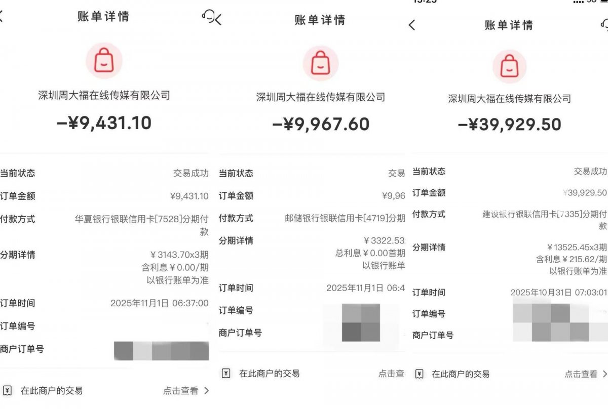 2025年11月8日,赵女士在核对华夏银行信用卡账单时发现,当期应还金额较自己记录的消费金额多出了3000多元。查阅账单明细后她发现,11月1日有一笔收款方为“深圳周大福在线传媒有限公司”的9431.1元订单并非自己操作,该订单需分3期偿还,每期金额3143.7元。怀疑信用卡被盗刷的赵女士连忙核查名下其他信用卡的消费记录,发现名下建设银行、邮储银行的信用卡,均出现了来自同一收款方的异常消费。其中,建设银行信用卡于10月31日被刷走了39929.5元,邮储银行信用卡则是在11月1日刷了9967.6元。赵女士称,三笔交易均发生在早上。