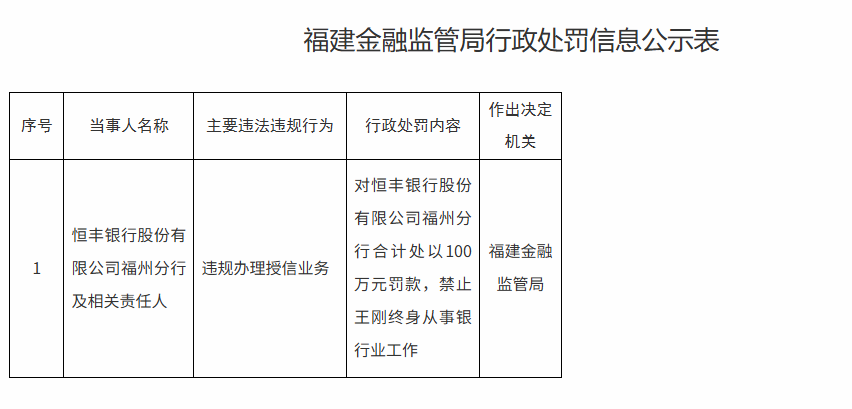 中新经纬1月24日电 福建金融监管局网站23日披露行政处罚信息公示表,因违规办理授信业务,对恒丰银行股份有限公司福州分行合计处以100万元罚款,禁止相关责任人王刚终身从事银行业工作。