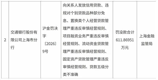 1月27日,国家金融监督管理总局上海监管局发布的行政处罚信息公开表显示,交通银行股份有限公司上海市分行(以下简称“交通银行上海分行”)因存在7项违法违规行为被罚没合计611.86951万元。