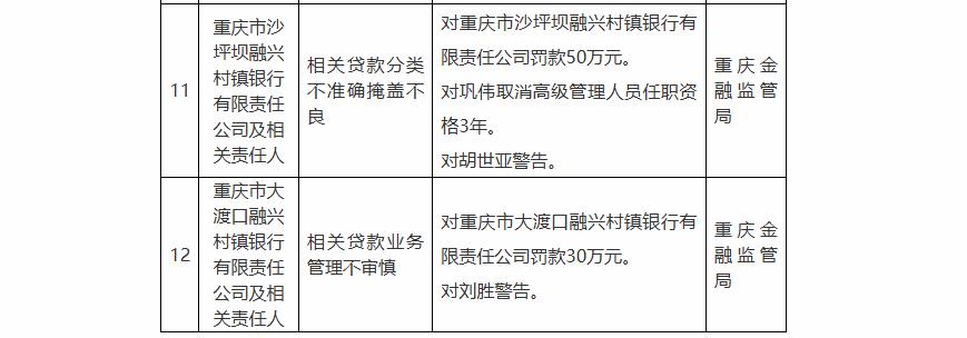 重庆金融监管局对重庆市沙坪坝融兴村镇银行有限责任公司罚款50万元。对巩伟取消高级管理人员任职资格3年。对胡世亚警告。