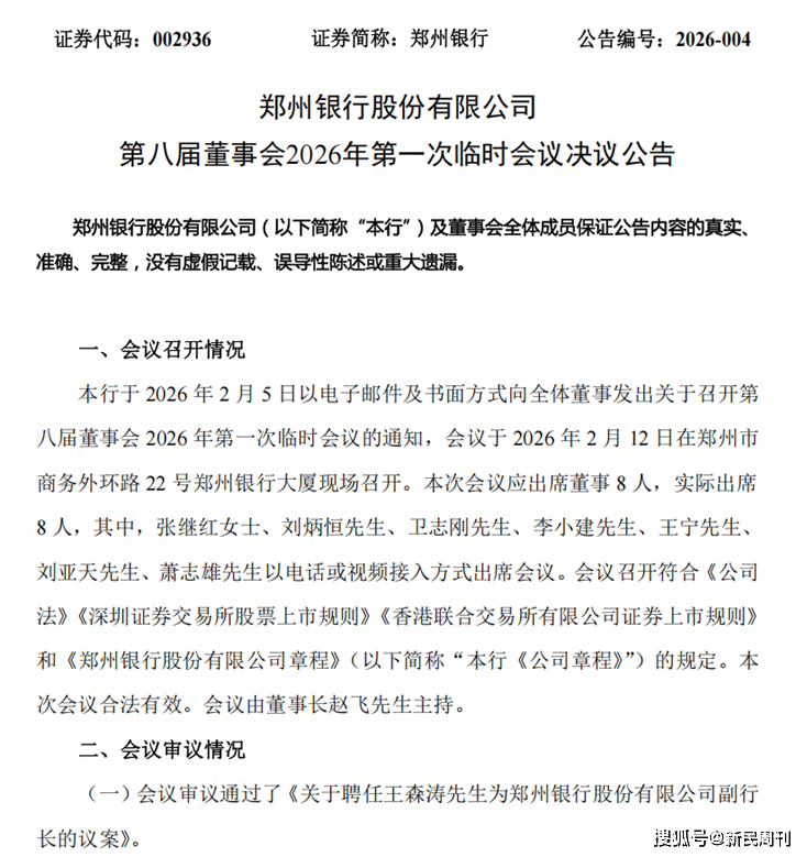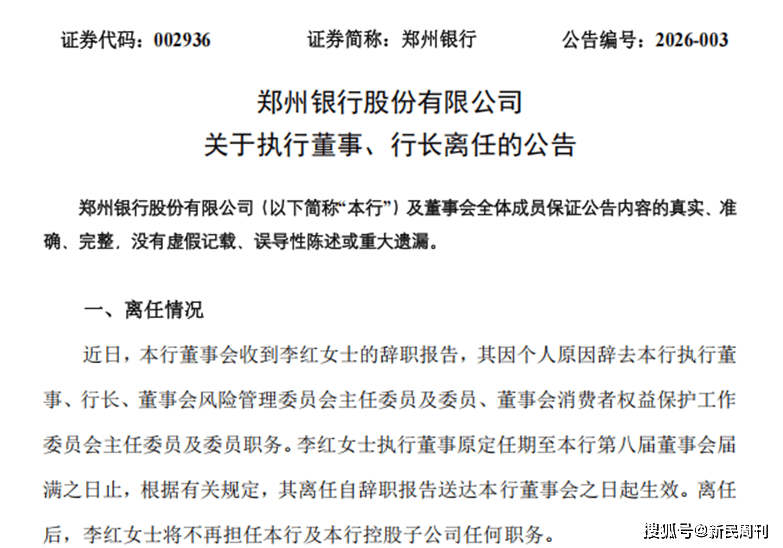 2月12日晚,郑州银行披露“一辞一聘”两则重要人事公告:行长李红因个人原因辞职,董事会审议通过聘任王森涛为副行长,待监管核准。作为全国首家“A+H”股上市城商行,郑州银行因高管层持续动荡再次引发关注。
