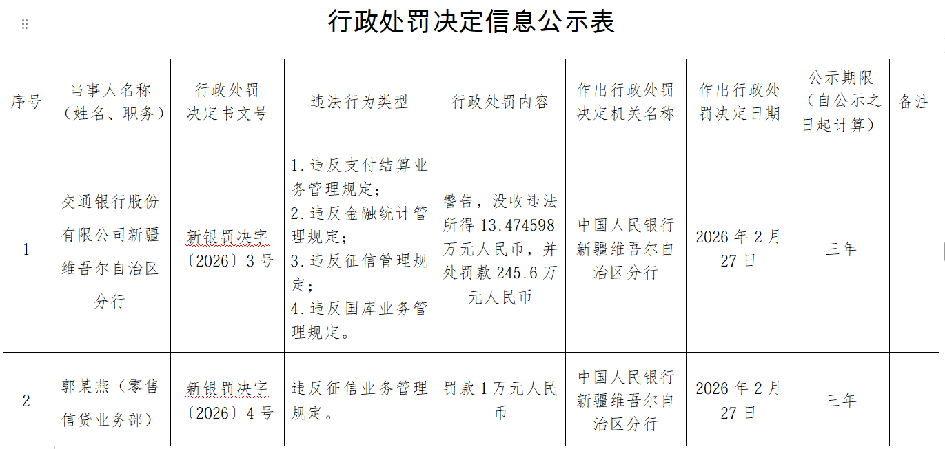 中国经济网北京3月2日讯 中国人民银行新疆维吾尔自治区分行2月28日发布行政处罚决定信息公示表(新银罚决字〔2026〕3-5号)。
