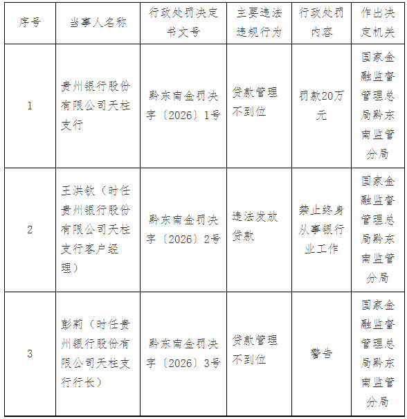 中国经济网北京3月7日讯 国家金融监督管理总局贵州监管局网站昨日披露的国家金融监督管理总局黔东南监管分局行政处罚信息公开表(黔东南金罚决字〔2026〕1号-3号)显示,贵州银行股份有限公司天柱支行贷款管理不到位,国家金融监督管理总局黔东南监管分局对其罚款20万元。