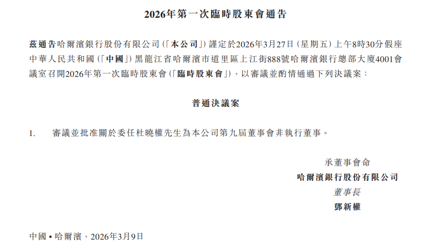 近日,哈尔滨银行(6138.HK)发布公告,公司将于3月27日召开2026年第一次临时股东会,审议关于委任杜晓权为公司第九届董事会非执行董事的议案。