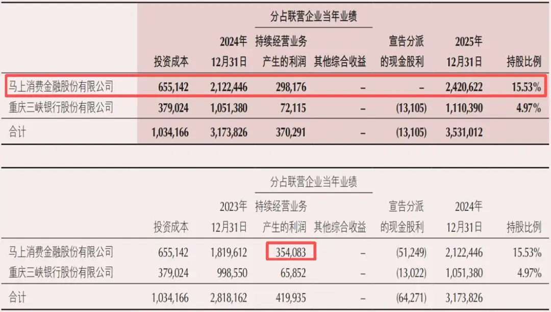 按照重庆银行持股马上消费金融15.53%股权比例来计算,去年,马上消费金融实现利润约19.2亿元,较2024年同比下滑了15.79%。