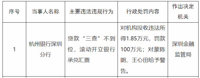 3月27日,国家金融监督管理总局深圳监管局官网公示的行政处罚决定书显示,杭州银行深圳分行因贷款“三查”不到位,滚动开立银行承兑汇票,被没收违法所得1.85万元,罚款100万元。同时蒙陈朗、王心田被警告。