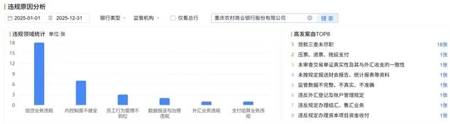 而这仅仅是重庆农商行2025年合规内控问题的“冰山一角”。据企业预警通统计,该行及其分支机构、相关责任人等全年累计收到罚单26张,其中18张罚单涉及信贷业务违规。