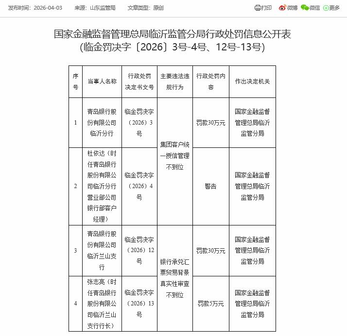 中国经济网北京4月4日讯 国家金融监督管理总局网站4月3日公布临沂监管分局行政处罚信息公开表(临金罚决字〔2026〕3号-4号、12号-13号)。