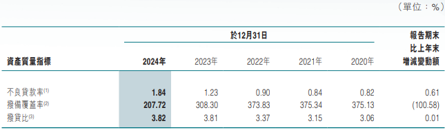 此前,东莞农商银行的不良贷款率已连升4年。2020年末、2021年末、2022年末、2023年末、2024年末,东莞农商银行的不良贷款率分别为0.82%、0.84%、0.90%、1.23%、1.84%。