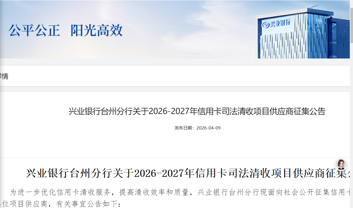 近日,兴业银行台州分行发布供应商征集公告,面向台州地区公开遴选信用卡司法清收合作单位,专门承接该行2026—2027年度信用卡逾期案件的司法催收工作。
