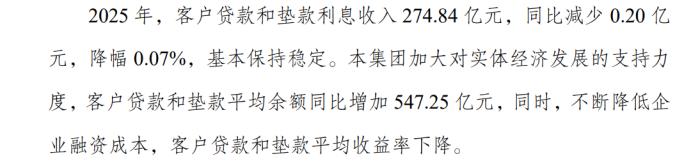 报告显示,2025 年,渝农商行实现利息收入464.65亿元,同比减少6.23亿元,降幅1.32%。渝农商行表示,主要受市场利率下调影响。2025年,客户贷款和垫款利息收入274.84亿元,同比减少0.20亿元,降幅0.07%。2025年,金融投资利息收入149.70亿元,同比减少8.15亿元,降幅5.16%。渝农商行在报告中表示,主要是资金市场利率下行,本集团金融投资收益率下降。