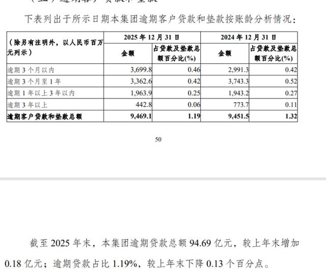 虽然总体的不良率是下降的,但其零售贷款不良率却在上升。据报告,截至2025年末,渝农商行零售贷款(含垫款)为3010.22亿元,其零售贷款不良率为2.07%,较上年末上行47个基点;零售贷款不良余额较上年末增加15.3亿元至62.17亿元。此外,该行新增逾期上行幅度最大,其逾期3个月以内贷款较上年末增长23.69%。