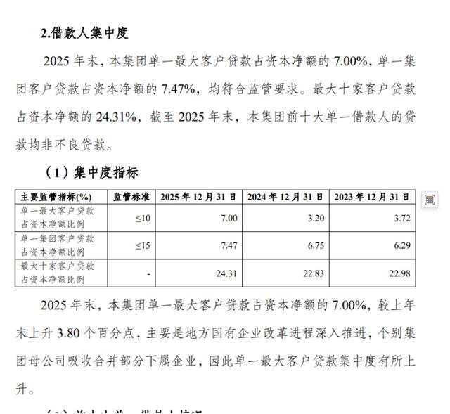 此外,记者注意到,渝农商行的单一客户集中度也在上升,2025年末,该行单一最大客户贷款占资本净额的7.00%,较上年末上升3.80个百分点,该指标监管标准为要小于等于10%,目前已经比较接近红线。该行称上升主要是地方国有企业改革进程深入推进,个别集团母公司吸收合并部分下属企业,因此单一最大客户贷款集中度有所上升。