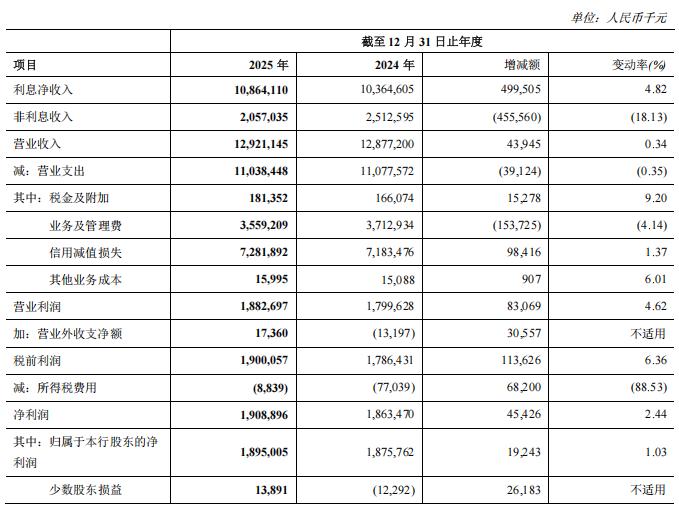 从全年数据来看,郑州银行交出了一份看似稳健的成绩单。截至2025年末,该行资产总额达到7436.74亿元,较上年末增长9.95%,增速创2018年以来新高,显示出较强的规模扩张能力。在盈利能力方面,全年实现营业收入129.21亿元,同比增长0.34%;归母净利润18.95亿元,同比增长1.03%。