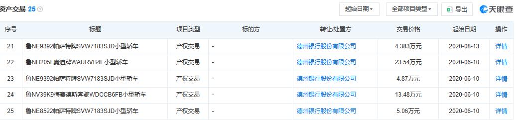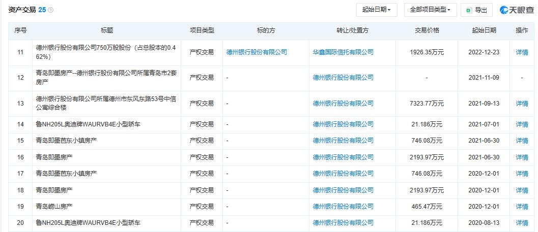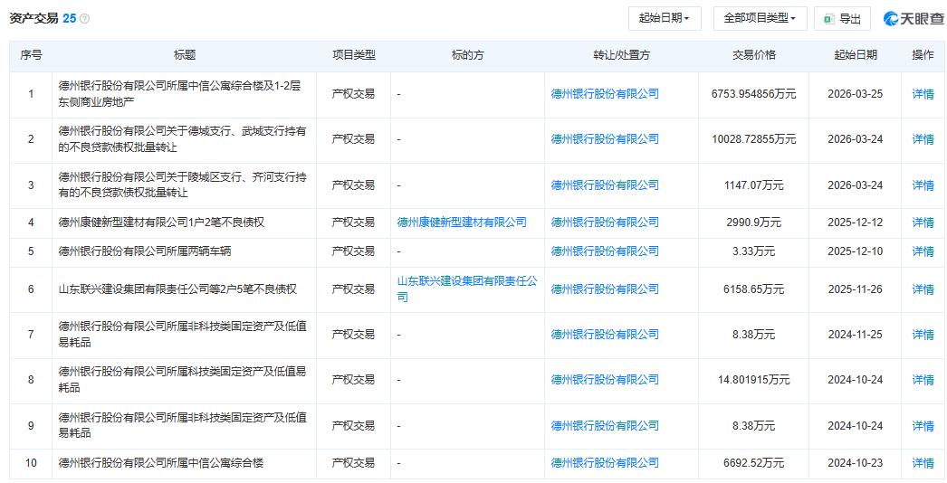 不仅房产,德州银行还打包出售不良贷款债权等资产。天眼查显示,德州银行上月批量转让德城支行、武城支行持有的不良贷款债权和陵城区支行、齐河支行持有的不良贷款债权,交易价格分别为1.00亿元、1147.07万元。