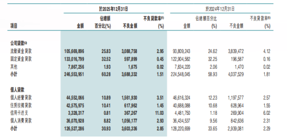 资产质量层面,东莞农商行呈现对公稳健、零售承压的显著分化格局。2025年末全行整体不良贷款率1.79%,同比微降0.05个百分点;公司贷款不良率1.51%,同比下降0.3个百分点,对公风控持续向好。