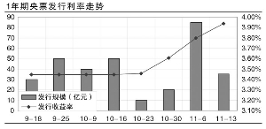 我们发现,在10月30日1年期央行票据和11月1日3个月央行票据收益率开始上扬前一周,央票发行的规模达到了历史最低的水平。10月23日和10月25日,1年期和3年期央行票据的发行量都仅有10亿元。由于央行在央票发行规模确定前都会向一级交易商事前确定投标需求,因此,如此低的发行规模,无疑说明在一二级市场长时间倒挂之后,投资者已经难以接受如此低的一级市场发行利率。可以肯定,在二级市场央票利率已经攀升至3.90%的位置,而央票发行利率仍然维持不变的局面下,部分一级交易商选择了放弃投标。