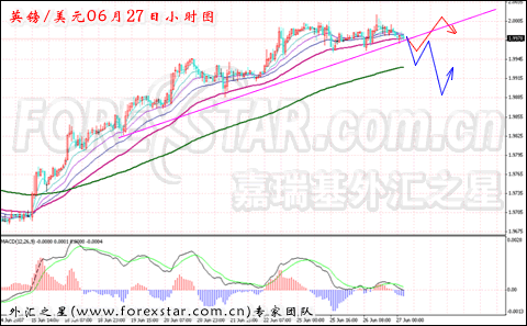 从小时图形上分析,短线汇价在均线系统的依托下窄幅震荡整理运行,从MACD指标来看已经形成了多次的顶背离现象。短线上涨动能逐渐减弱,而汇价仍在55日均线的支撑下运行。4小时图形上,均线系统呈多头运行,短线主趋势仍保持上涨为主,预计英镑/美元短线汇价仍保持高位盘整格局,若不能有效突破2.0将存在下落的风险。