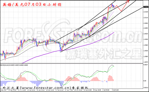 英镑/美元短线走势在汇价测试2.0100附近位置后,汇价出现多次的反复性,小时图上连续8根K线的交替走势,最后英镑突破阻力创历史高点2.0186一线价位。日线图上汇价已经远远超于前期高点位置,英镑/美元中线上涨行情继续保持。