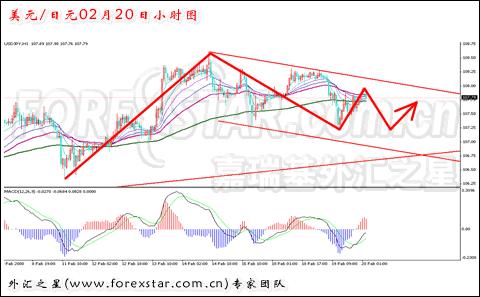 日线图,美元兑日元的冲高进程再度宣告失利,108.60的此前高点加均线系统的压制位成为了上方最强的阻力。现在汇价在此前下跌的最后一个显著高点107.87一带游弋,MACD快慢线已经上行接近零轴,多头动能依旧十分充足。短线上,4小时图可以看出美日又形成了一个新的下降通道,同时,下方的上升趋势线仍将保持良好的支撑效果。最近美日一直保持着缓慢上涨的势头,振荡低点抬高,现在就是需要一举冲高来标志着筑底的真正成功。小时图,昨天构筑的小旗形又一次失败,日元不断忽悠广大群众。预计今天美日将是一个先跌后涨的运行态势。