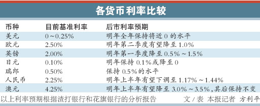 目前美元利率低至0~0.25%,日元利率低至0.1%,瑞郎利率也低至0.5%。而英镑利率虽然仍为2.0%,但明年有望降至接近零的水平。而欧元利率虽目前为2.5%,也有望继续下调。明年全球将处低利率时代。